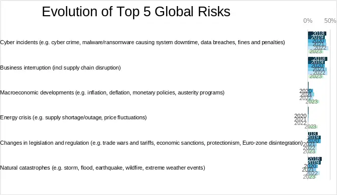 Desde entonces, los incidentes cibernéticos han aumentado constantemente cada año, hasta convertirse finalmente en la principal causa de riesgo a nivel mundial. No solo eso, en comparación, ni siquiera la COVID-19 en el pico de la pandemia, ni la crisis energética derivada de la guerra entre Ucrania y Rusia han captado tanta atención como fuente de posibles perturbaciones para las operaciones.