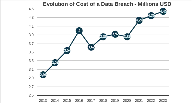Figura 3. Evolución del coste de una violación de datos - Millones de dólares estadounidenses. Fuente: IBM y Ponemon Institute, análisis de Apeiroo Las cifras representan el coste en millones de dólares estadounidenses de una violación de datos cibernéticos.